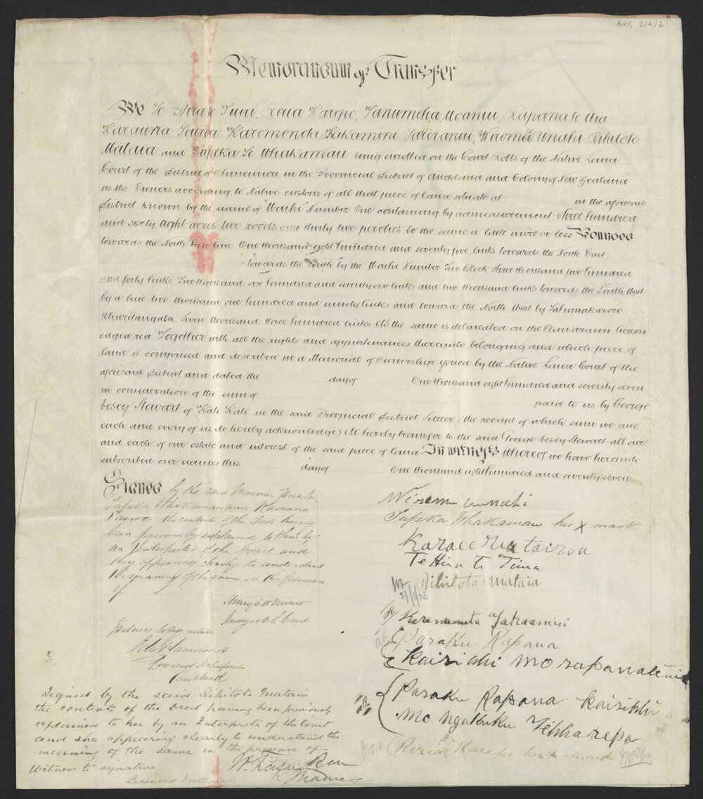 Date1877 to 1878Reference NumberAms 214/2DescriptionHandwritten parchment bi-fold memorandum acknowledging the transfer of land block 'Waihī Number One' in the district of Ohinemuri from Māori land owners to George Vesey Stewart, dated 1877.