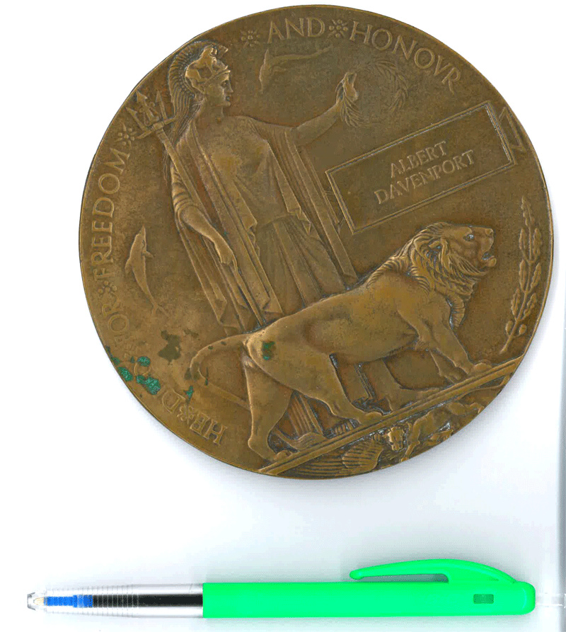 DescriptionACKNOWLEDGEMNT ALAN STANYER, Grandson to Albert Davenport who died in active service during WWI. This Memorial Plaque was issued to the nextofkin of all British and Empire service personnel who died during or as a result of the First World War.