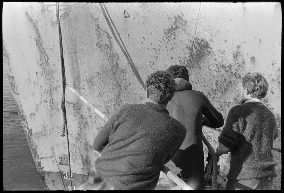 Date15 July 1971Reference Numberphoto gcc-18647DescriptionMount News. Hull of the Seaboard ship, three men work with ropes. Published 15 July 1971.Physical Description35mm black-and-white negative (2/3)Photographer/CreatorBay of Plenty Times
