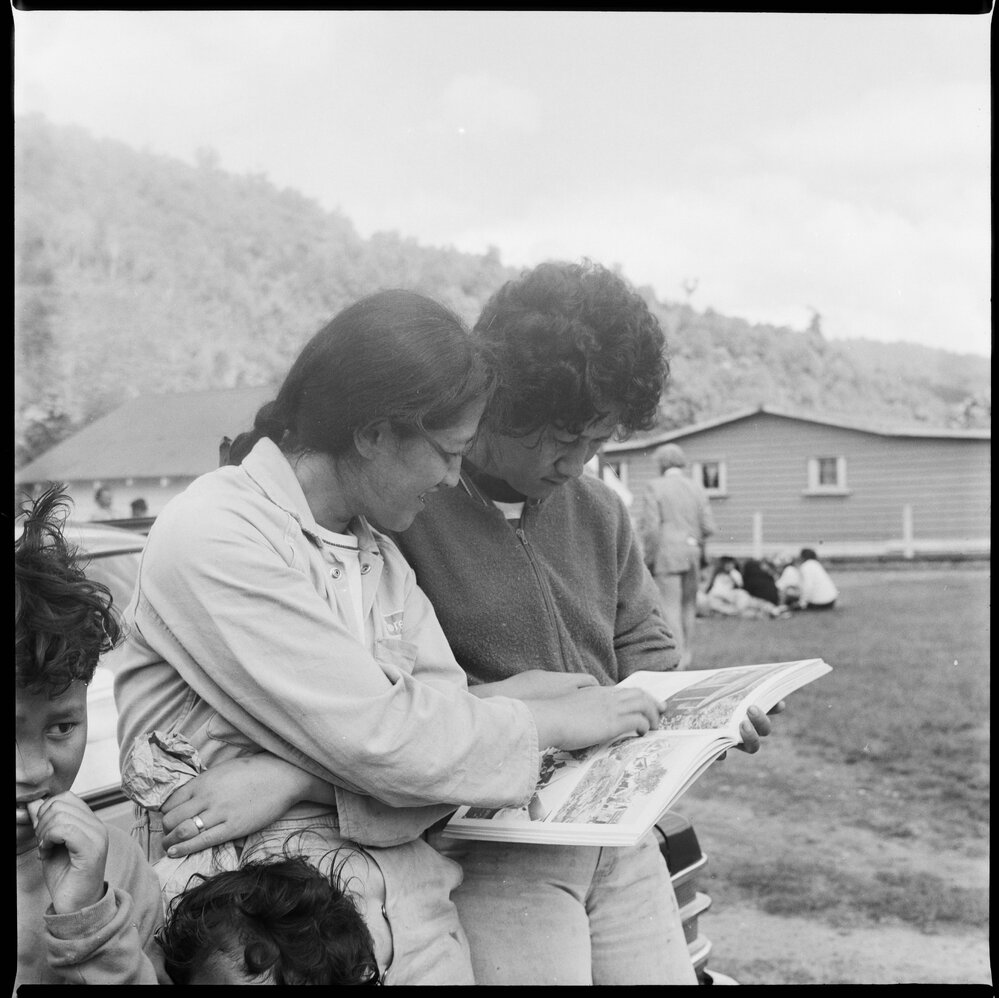 Members of Matahi community reading "Mihaia : the prophet Rua Kenana and his community at Maungapōhatu" at its presentation to them by two of its compilers, Judith Binney and Gillian Chaplin. (22 November 1979). Pae Korokī, accessed 03/04/2026, https://paekoroki.tauranga.govt.nz/nodes/view/104994