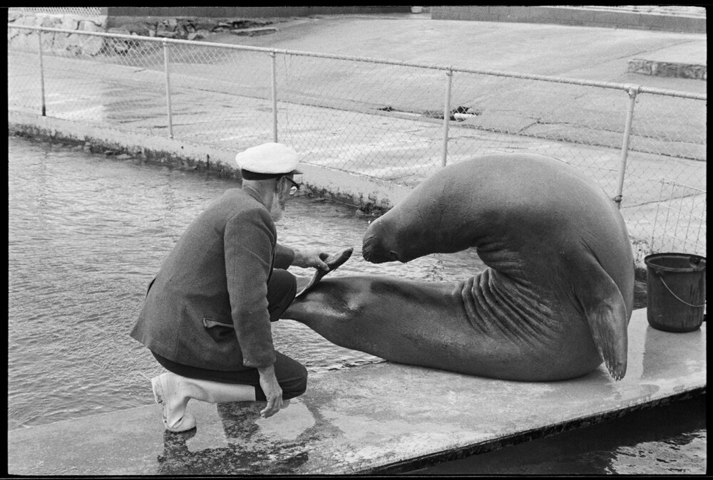 "Captain" Tom Allison, Marineland head keeper, feeding sea elephant Caesar. (19 August 1972). Pae Korokī, accessed 06/04/2026, https://paekoroki.tauranga.govt.nz/nodes/view/105260