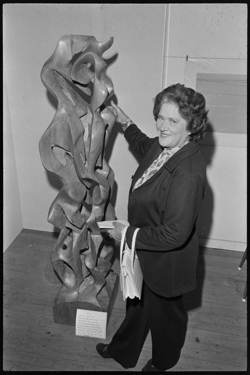 Sculpture by Jon Freeland of Mount Maunganui, inspected by his mother Mrs O. P. Smith, at the Tauranga Art Society Gallery.