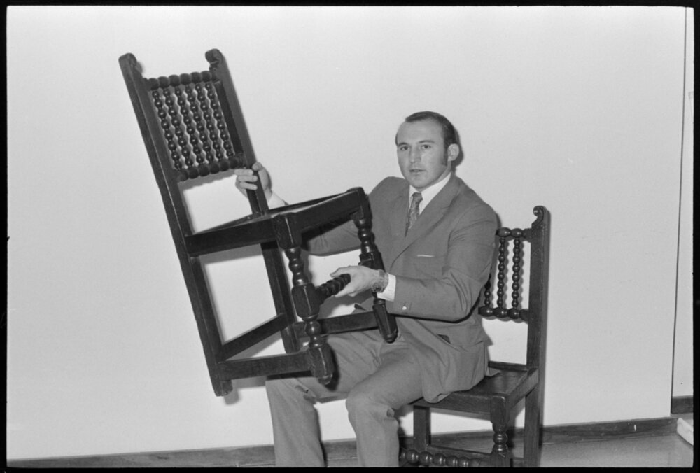 Date15 May 1972Reference NumberPhoto gcc-20597DescriptionMr T. J. Dalton with two of the antique chairs to be auctioned at a fine arts auction, Bay of Plenty's first, held at the Dalton and Hitchcock. Not published 15 May 1972Physical Description35mm black-and-white negative (3/3)Photographer/CreatorBay of Plenty Times