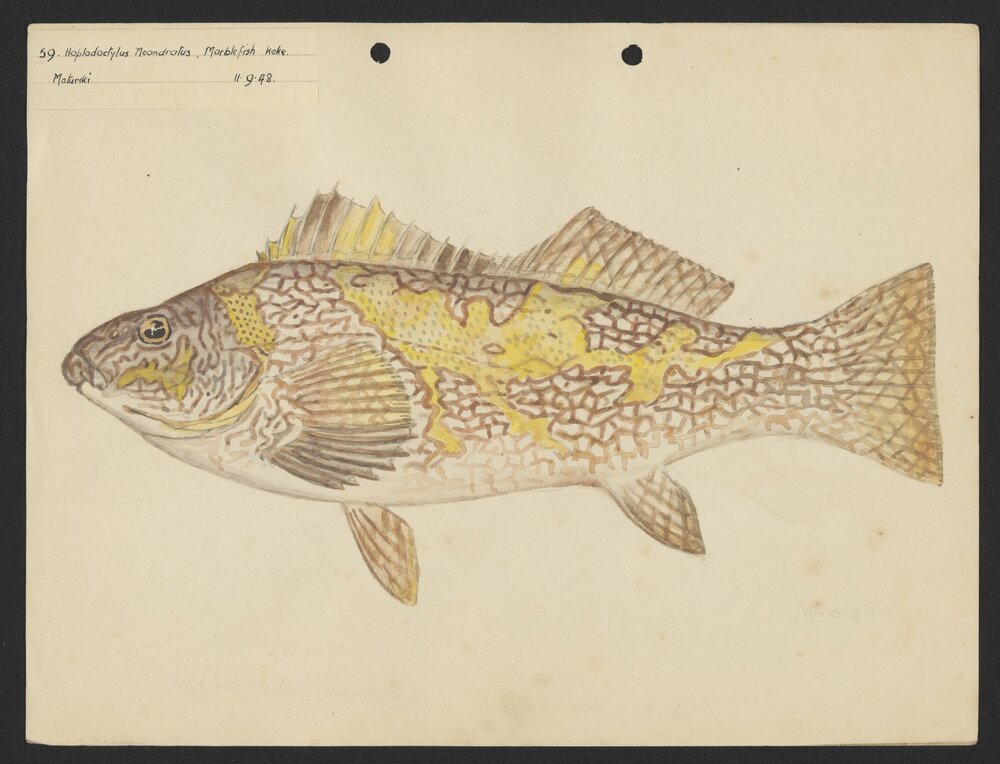 Watson, Arnold Henfrey, 1882-1960, Hoplodactylus Meandratus, Marble Fish, Keke, Moturiki (11 September 1948). Pae Korokī, accessed 25/03/2026, https://paekoroki.tauranga.govt.nz/nodes/view/107823