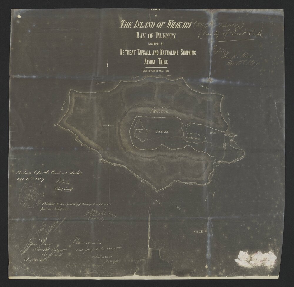 The Native Land Court of New Zealand, Plan of The Island of Whakaari, Bay of Plenty claimed by Retreat Tapsall and Kathaline Simpkins [sic] Arawa Tribe (15 October 1867). Pae Korokī, accessed 11/02/2026, https://paekoroki.tauranga.govt.nz/nodes/view/108118
