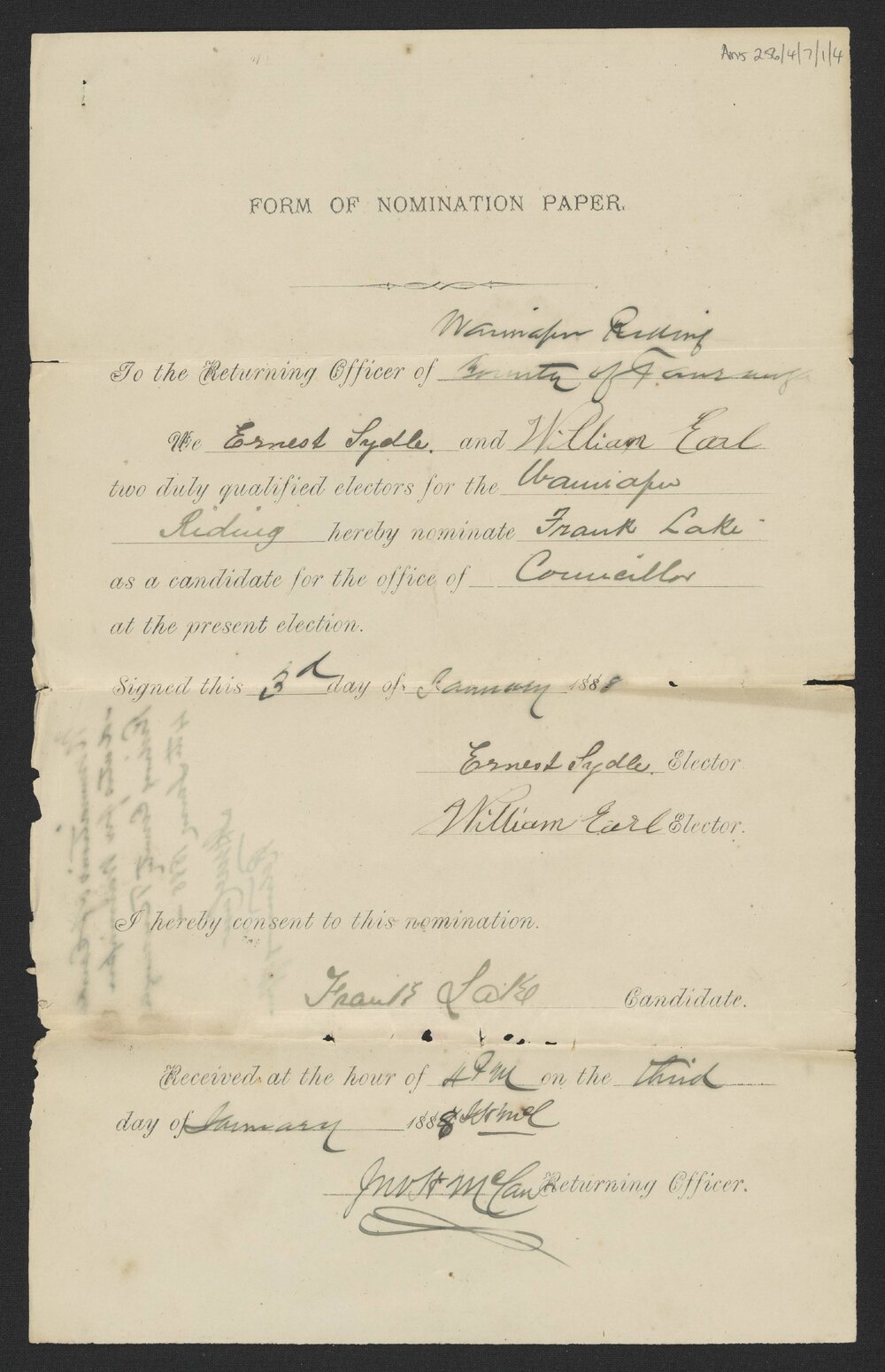 Form of nomination paper for R.C. Fraser, Jan 1888 (3 January 1888). Pae Korokī, accessed 02/04/2026, https://paekoroki.tauranga.govt.nz/nodes/view/108177