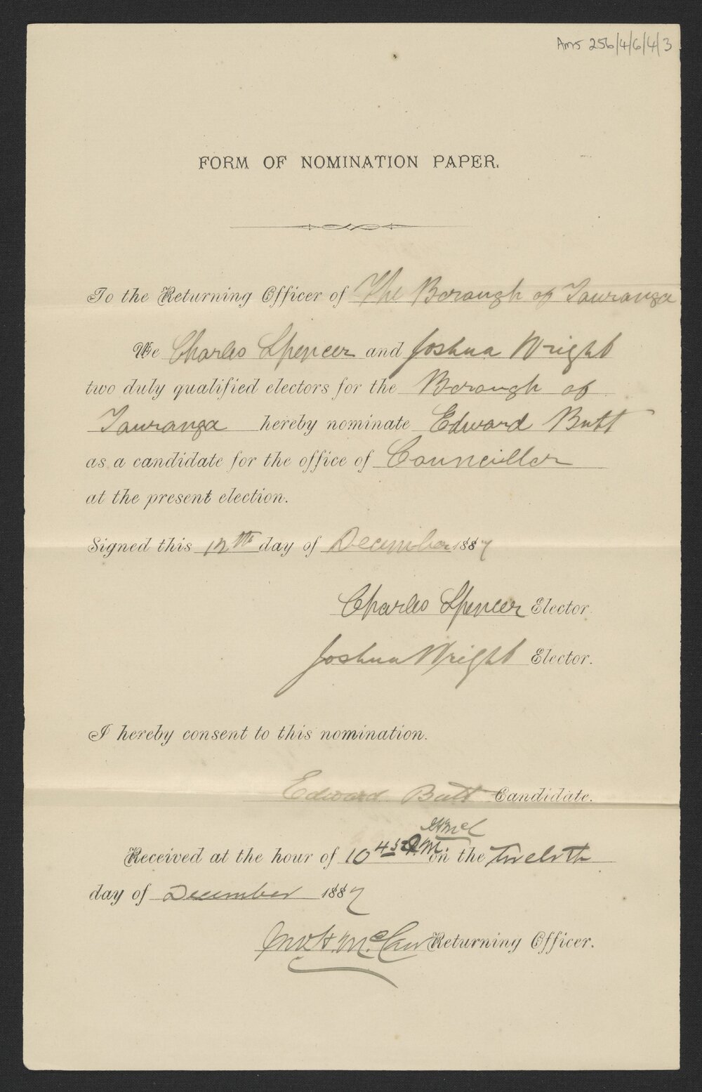 Form of nomination paper for E. Butt, Dec 1887 (9 December 1887). Pae Korokī, accessed 15/02/2026, https://paekoroki.tauranga.govt.nz/nodes/view/108181