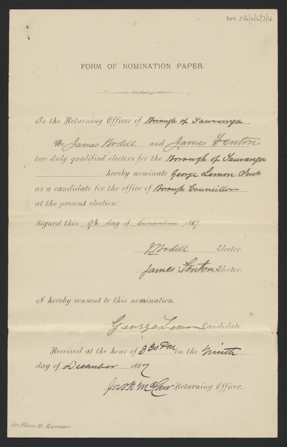 Form of nomination paper for J.L. Jenks, Dec 1887 (9 December 1887). Pae Korokī, accessed 23/01/2026, https://paekoroki.tauranga.govt.nz/nodes/view/108184