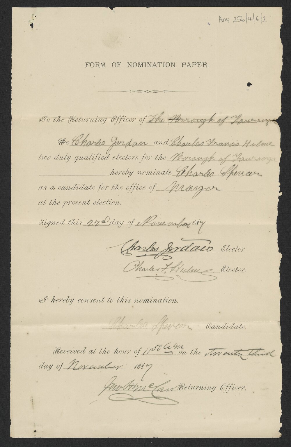 Form of nomination paper for C. Spencer, Nov 1887 (23 November 1887). Pae Korokī, accessed 02/04/2026, https://paekoroki.tauranga.govt.nz/nodes/view/108188