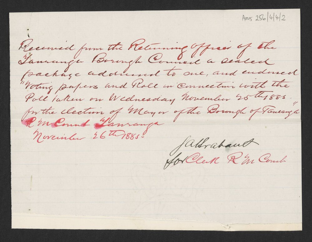 Cover note for nomination papers of Mayor of the Borough of Tauranga, Nov 1885 (26 November 1885). Pae Korokī, accessed 02/04/2026, https://paekoroki.tauranga.govt.nz/nodes/view/108199
