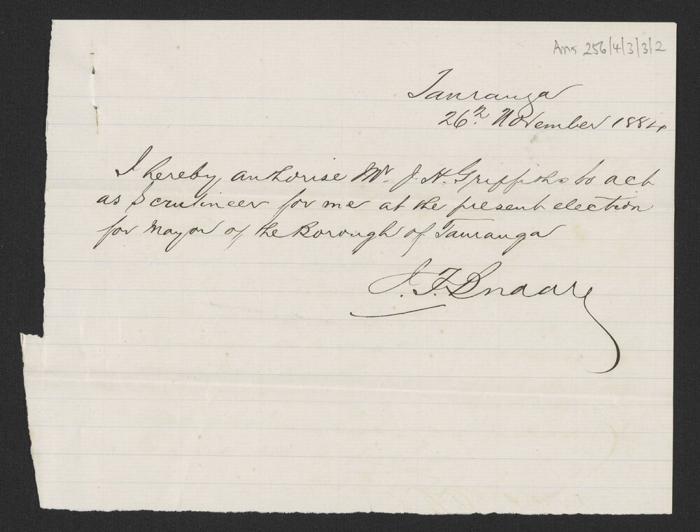 Declaration of scrutineers for J.F. Buddle, Nov 1884 (26 November 1884). Pae Korokī, accessed 02/04/2026, https://paekoroki.tauranga.govt.nz/nodes/view/108201