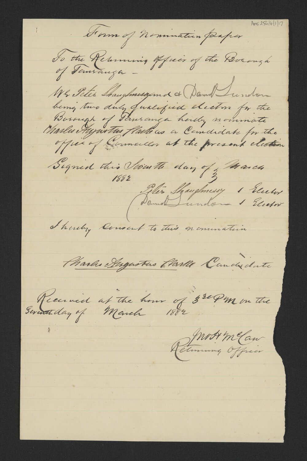 McCaw, John Harris, 1835-1915, Form of nomination paper for C.A. Clarke, Mar 1882 (8 March 1882). Pae Korokī, accessed 02/04/2026, https://paekoroki.tauranga.govt.nz/nodes/view/108222