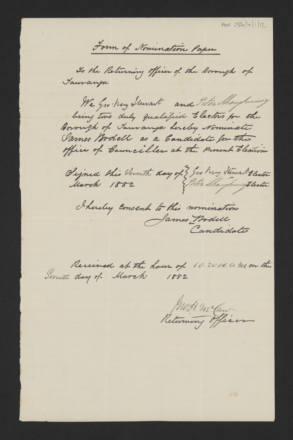 McCaw, John Harris, 1835-1915, Form of nomination paper for J. Bodell, Mar 1882 (8 March 1882). Pae Korokī, accessed 02/04/2026, https://paekoroki.tauranga.govt.nz/nodes/view/108227