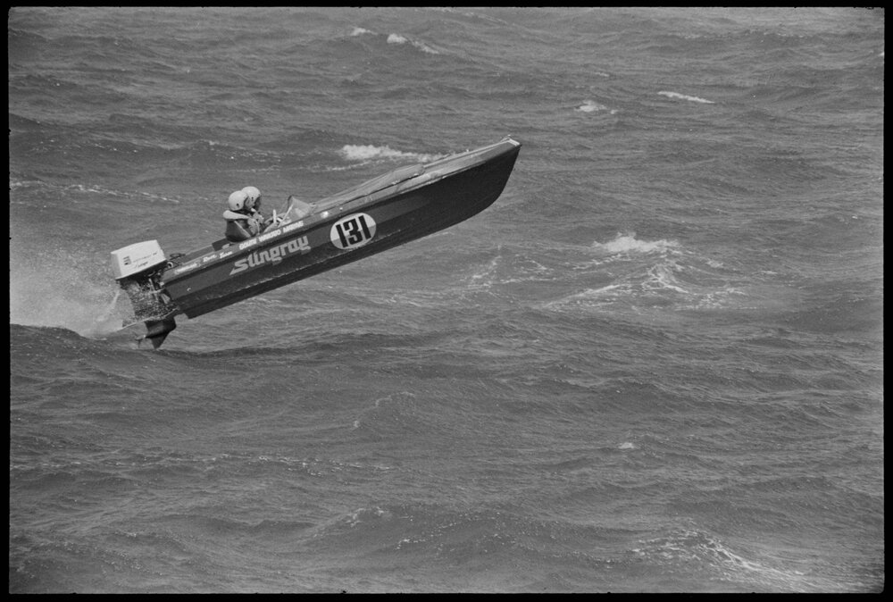 Date11 October 1971Reference Numberphoto gcc-19019DescriptionPower boat "Stingray", raced by C. Selby of Tairi, during the BP 100-mile race in Tauranga. Published 11 October 1971.FormatNegativePhysical Description35mm black-and-white negative (3/3)Photographer/CreatorBay of Plenty Times
