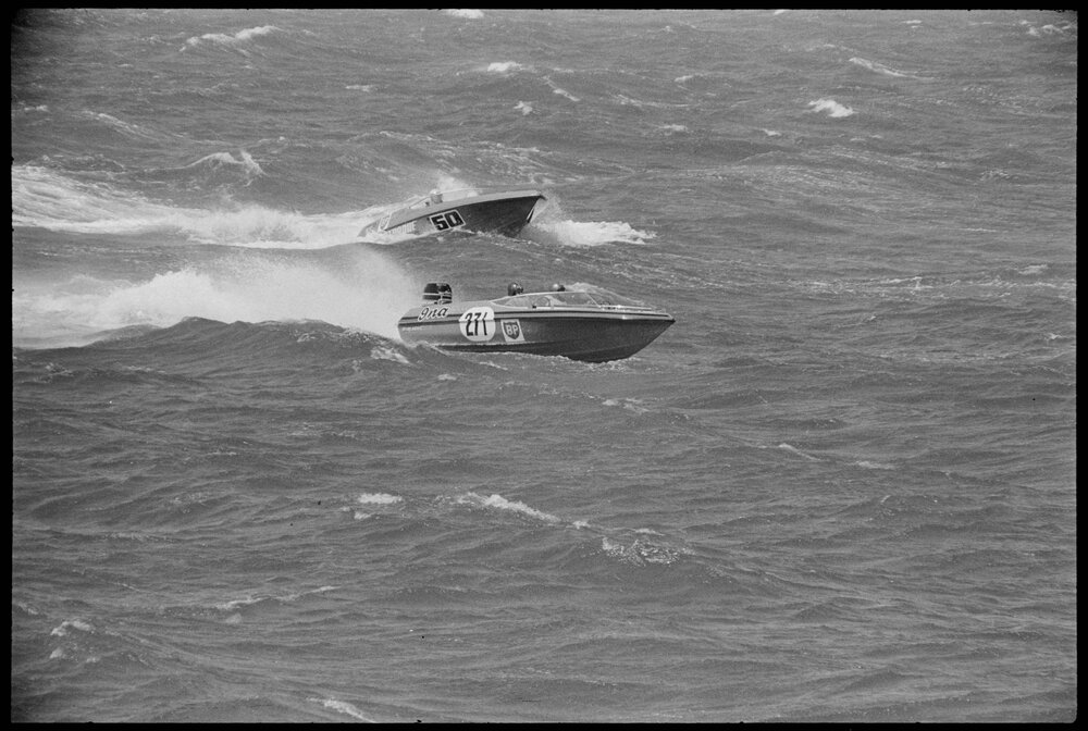 Date11 October 1971Reference Numberphoto gcc-19021DescriptionThe BP Power Boat racing in Tauranga Harbour. Published 11 October 1971.FormatNegativePhysical Description35mm black-and-white negative (2/3)Photographer/CreatorBay of Plenty Times