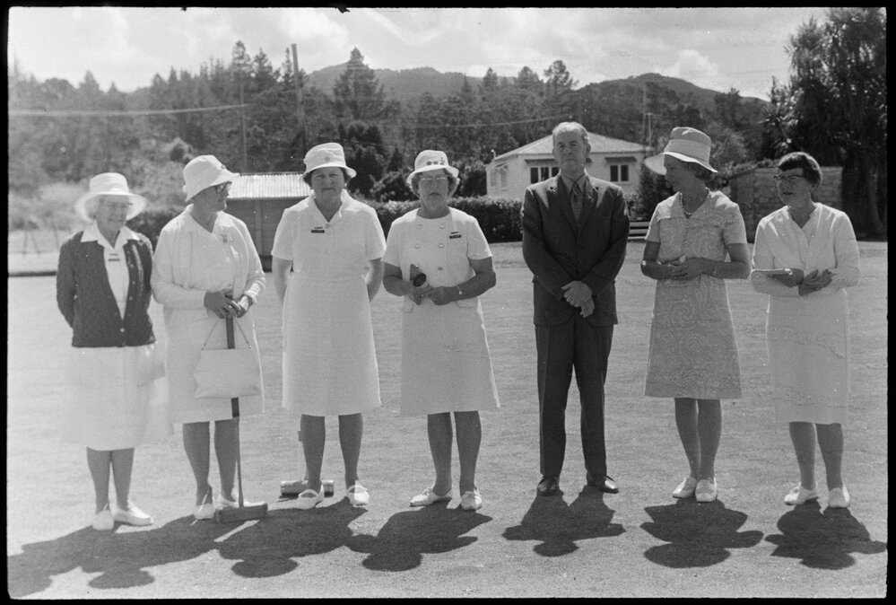 Date12 October 1971Reference Numberphoto gcc-19049DescriptionSixty years of croquet are celebrated in a diamond jubilee at the Waihī Croquet Club with distinguished guests. Mrs C. Duffy presented a sheaf of flowers to life member, Mrs I Scott. Published 12 October 1971.FormatNegativePhysical Description35mm black-and-white negative (1/3)Photographer/CreatorBay of Plenty Times