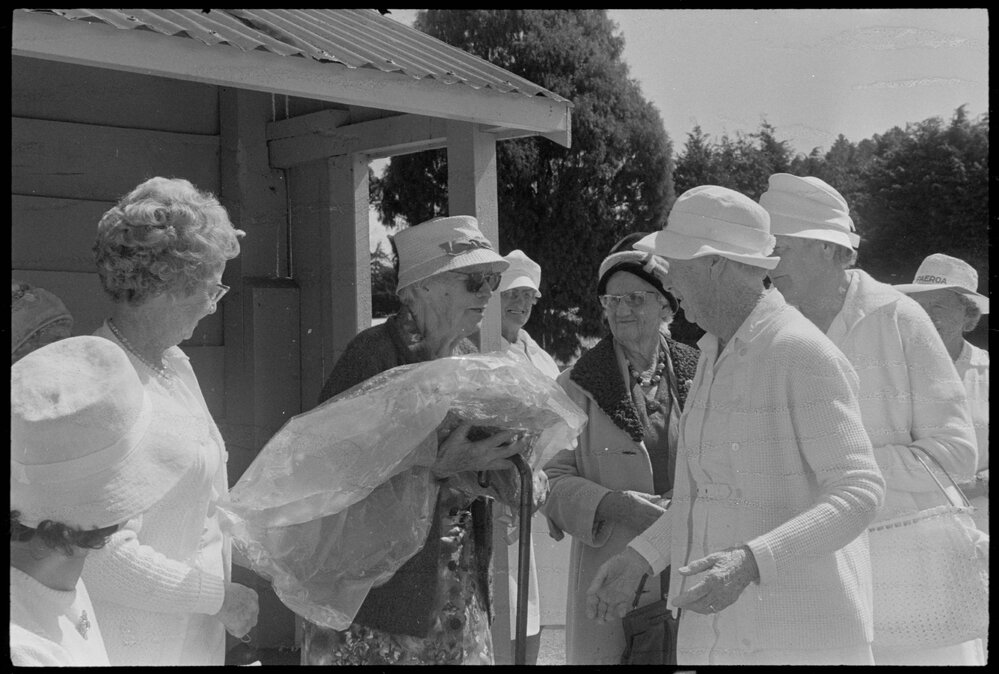 Date12 October 1971Reference Numberphoto gcc-19050DescriptionSixty years of croquet are celebrated in a diamond jubilee at the Waihī Croquet Club with distinguished guests. Mrs C. Duffy presented a sheaf of flowers to life member, Mrs I Scott. Published 12 October 1971.FormatNegativePhysical Description35mm black-and-white negative (2/3)Photographer/CreatorBay of Plenty Times