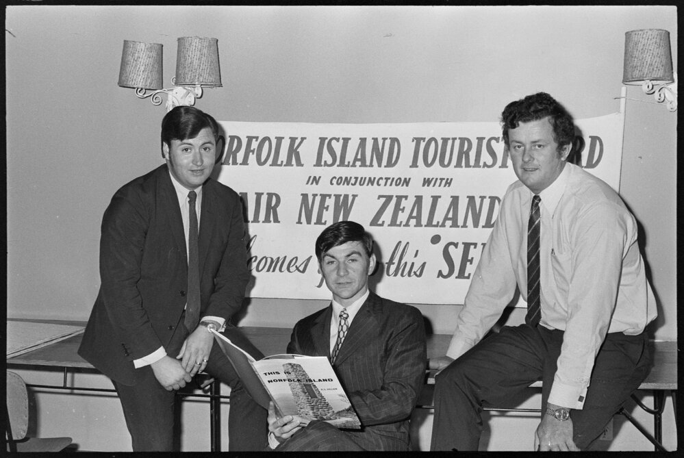 Date21 October 1971Reference Numberphoto gcc-19112DescriptionI. W. Kenny (left) and D. E. Buffett (centre) of the Norfolk Island Tourist Board with an Air New Zealand representative, R. L. Keane, at seminar. Published 21 October 1971.FormatNegativePhysical Description35mm black-and-white negative (1/3)Photographer/CreatorBay of Plenty Times