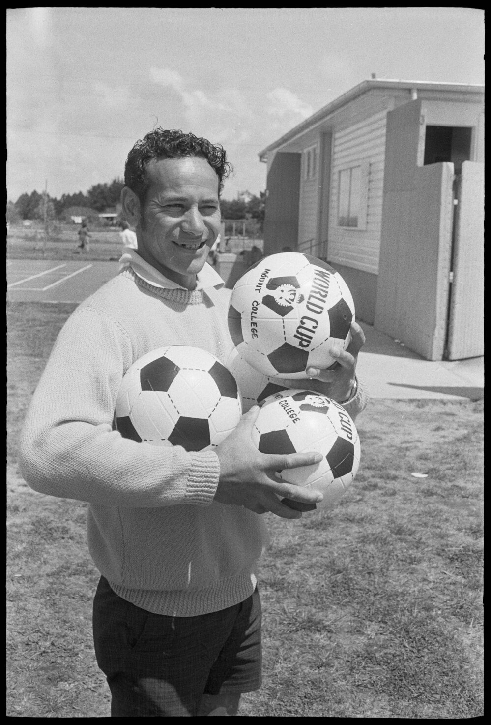 Date29 October 1971Reference Numberphoto gcc-19200DescriptionMr W. Smith, physical education teacher at Mount Maunganui College, with the practice soccer balls given to the school. Published 29 October 1971.FormatNegativePhysical Description35mm black-and-white negative (1/3)Photographer/CreatorBay of Plenty Times