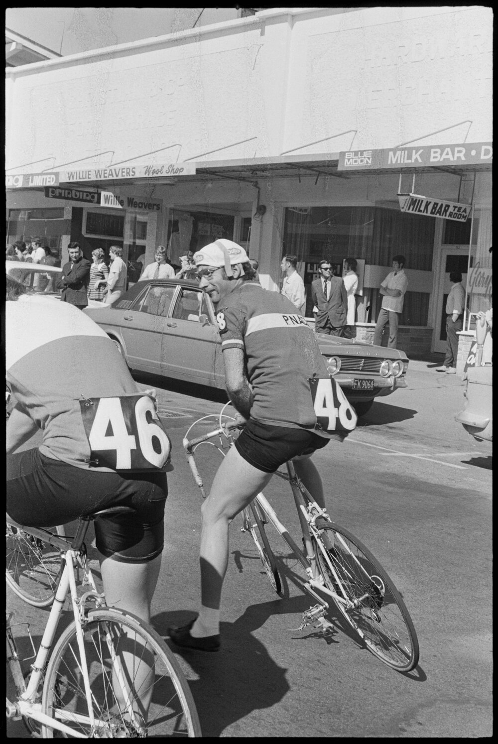 Date5 November 1971Reference Numberphoto gcc-19209DescriptionPalmerston North rider, Martin Baker (No. 48), is racing the Dulux six day cycle race and is shown here in Morrinsville. Published 5 November 1971.FormatNegativePhysical Description35mm black-and-white negative (1/3)Photographer/CreatorBay of Plenty Times