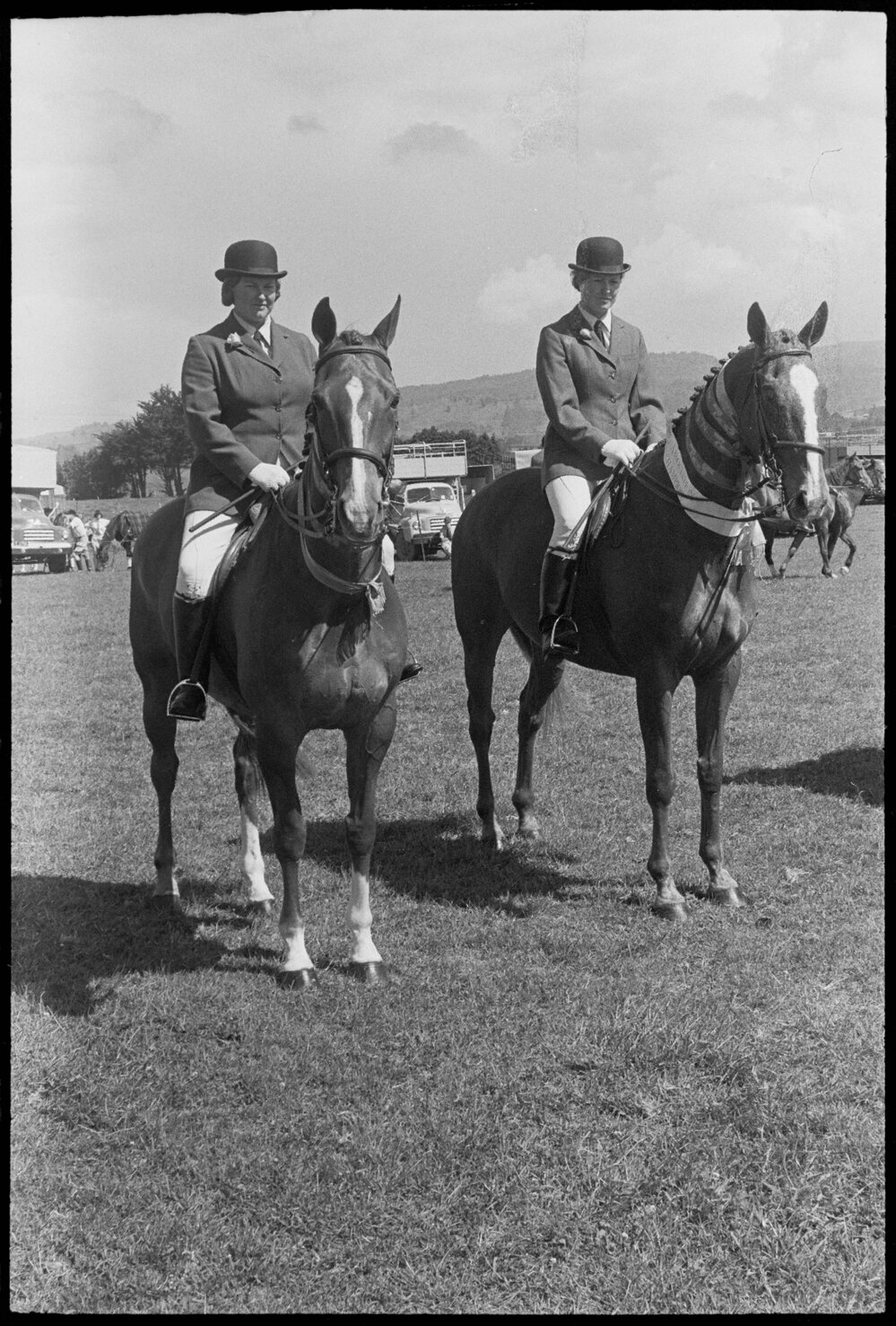 Date18 November 1971Reference Numberphoto gcc-19259DescriptionTwo horses and their riders at the Waihī A&P Show. Published 18 November 1971.FormatNegativePhysical Description35mm black-and-white negative (2/2)Photographer/CreatorBay of Plenty Times