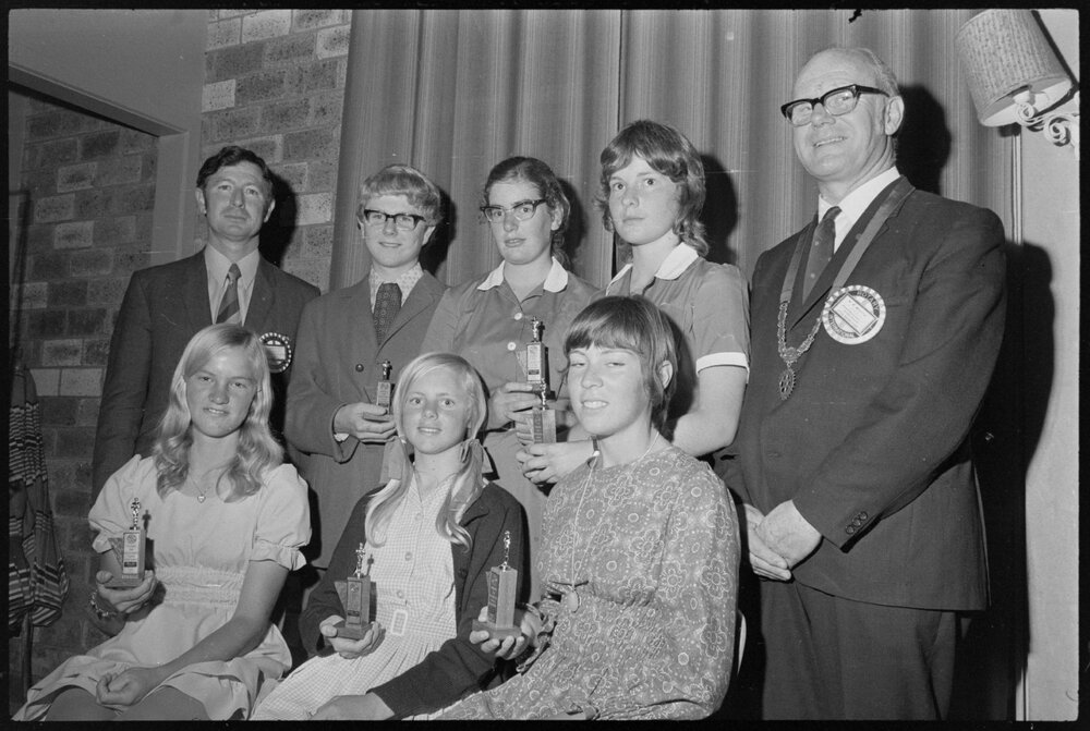 Date23 November 1971Reference Numberphoto gcc-19313DescriptionAwards were presented by the Ōtūmoetai Rotary Club president N. R. White (at right) and director of the vocation committee, T. J. Robertson (left). Pictured are the seven youth recipients, back row, from left, Alistair Ross, Gwen Proctor, Alison Jones; front, Gayle Reid, Deborah Grant and Caron Jones. Published 23 November 1971.FormatNegativePhysical Description35mm black-and-white negative (1/9)Photographer/CreatorBay of Plenty Times