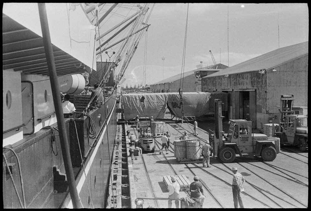Date26 November 1971Reference Numberphoto gcc-19370DescriptionPart of the canvas "tunnel" joining the side of the Hupeh to the cargo sheds at Mount Maunganui Wharf. Published 26 November 1971.FormatNegativePhysical Description35mm black-and-white negative (1/19)Photographer/CreatorBay of Plenty Times
