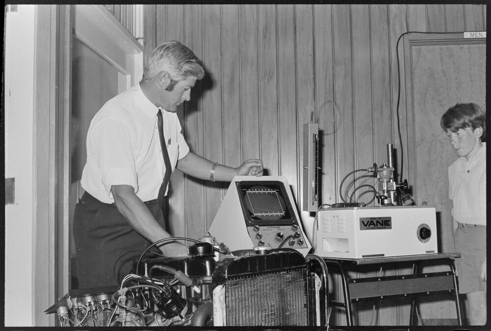 Date2 December 1971Reference Numberphoto gcc-19475DescriptionMr B. Tait, a night class instructor at Tauranga Boys' College, demonstrates an ignition scope. Published 2 December 1971.FormatNegativePhysical Description35mm black-and-white negative (1/3)Photographer/CreatorBay of Plenty Times
