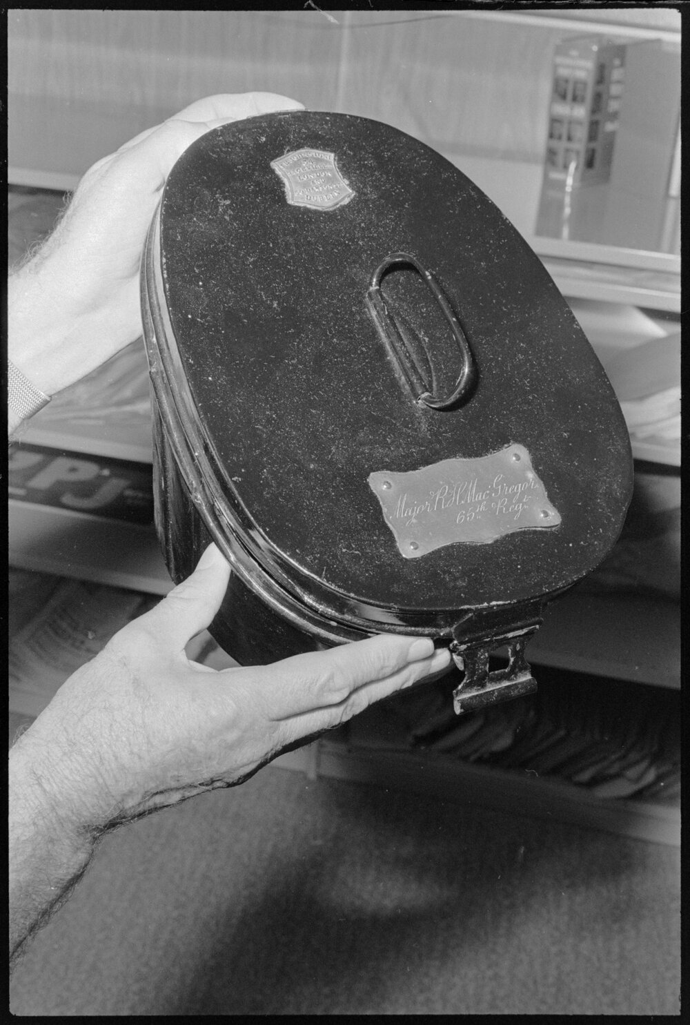 Date3 December 1971Reference Numberphoto gcc-19503DescriptionA military hat box was donated to the Tauranga District Museum by Mrs M. Best of Katikati. Published 3 December 1971.FormatNegativePhysical Description35mm black-and-white negative (1/3)Photographer/CreatorBay of Plenty Times