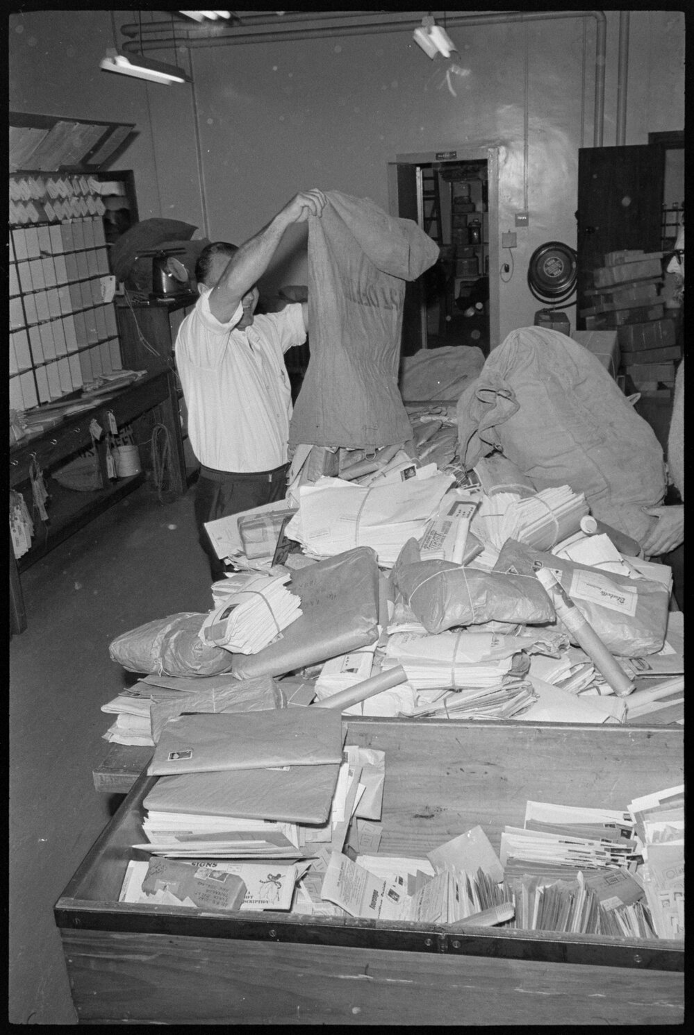 Date7 December 1971Reference Numberphoto gcc-19512DescriptionSenior mail clerk, I. D. Skerton, pours packets of Christmas mail on to the sorting table at 5.30am at Tauranga's Chief Post Office. Published 7 December 1971.FormatNegativePhysical Description35mm black-and-white negative (1/3)Photographer/CreatorBay of Plenty Times