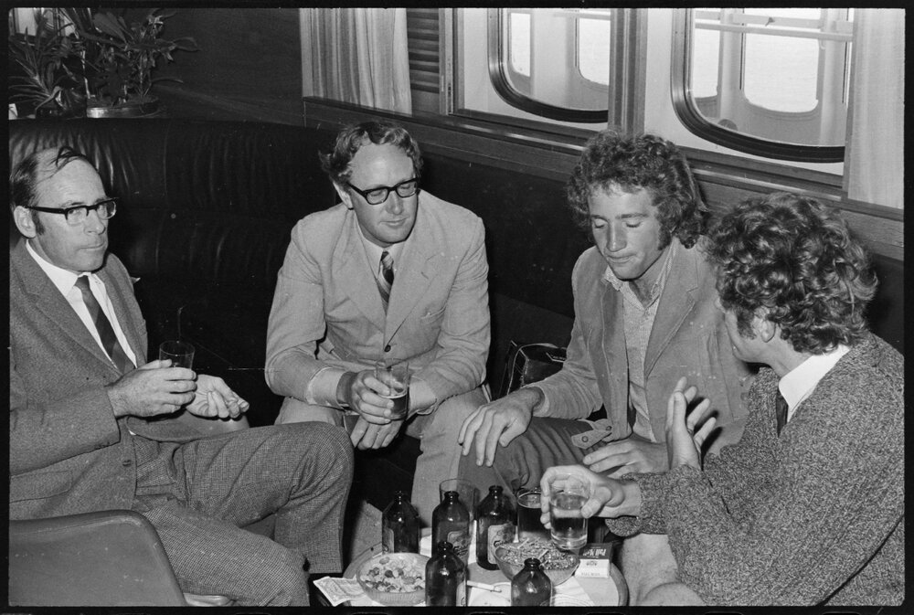 Date14 February 1972Reference Numberphoto gcc-19552DescriptionMen having a few drinks onboard the ship Kungsholm. Published 14 February 1972.FormatNegativePhysical Description35mm black-and-white negative (2/6)Photographer/CreatorBay of Plenty Times