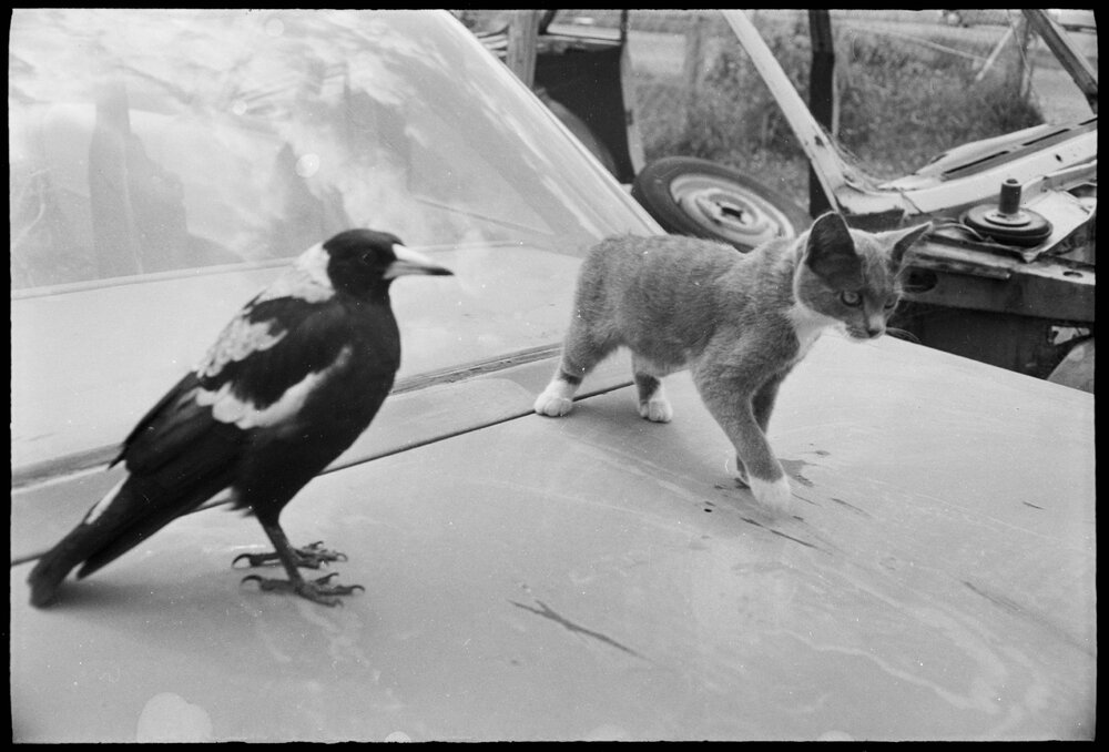 Date14 February 1972Reference Numberphoto gcc-19569DescriptionMagpie and kitten on car bonnet. Mount News. Published 14 February 1972.FormatNegativePhysical Description35mm black-and-white negative (7/7)Photographer/CreatorBay of Plenty Times