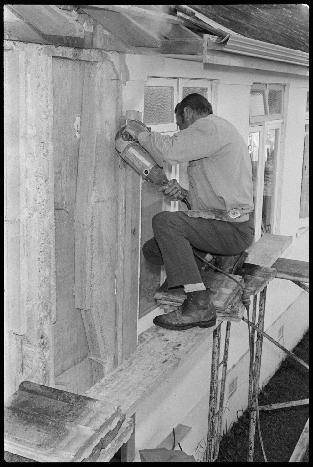 Date10 April 1972Reference Numberphoto gcc-19901DescriptionClive Morrow attempts to demolish a concrete wall in his Ōtūmoetai house, with an electric grinder. Published 10 April 1972.FormatNegativePhysical Description35mm black-and-white negative (1/3)Photographer/CreatorBay of Plenty Times
