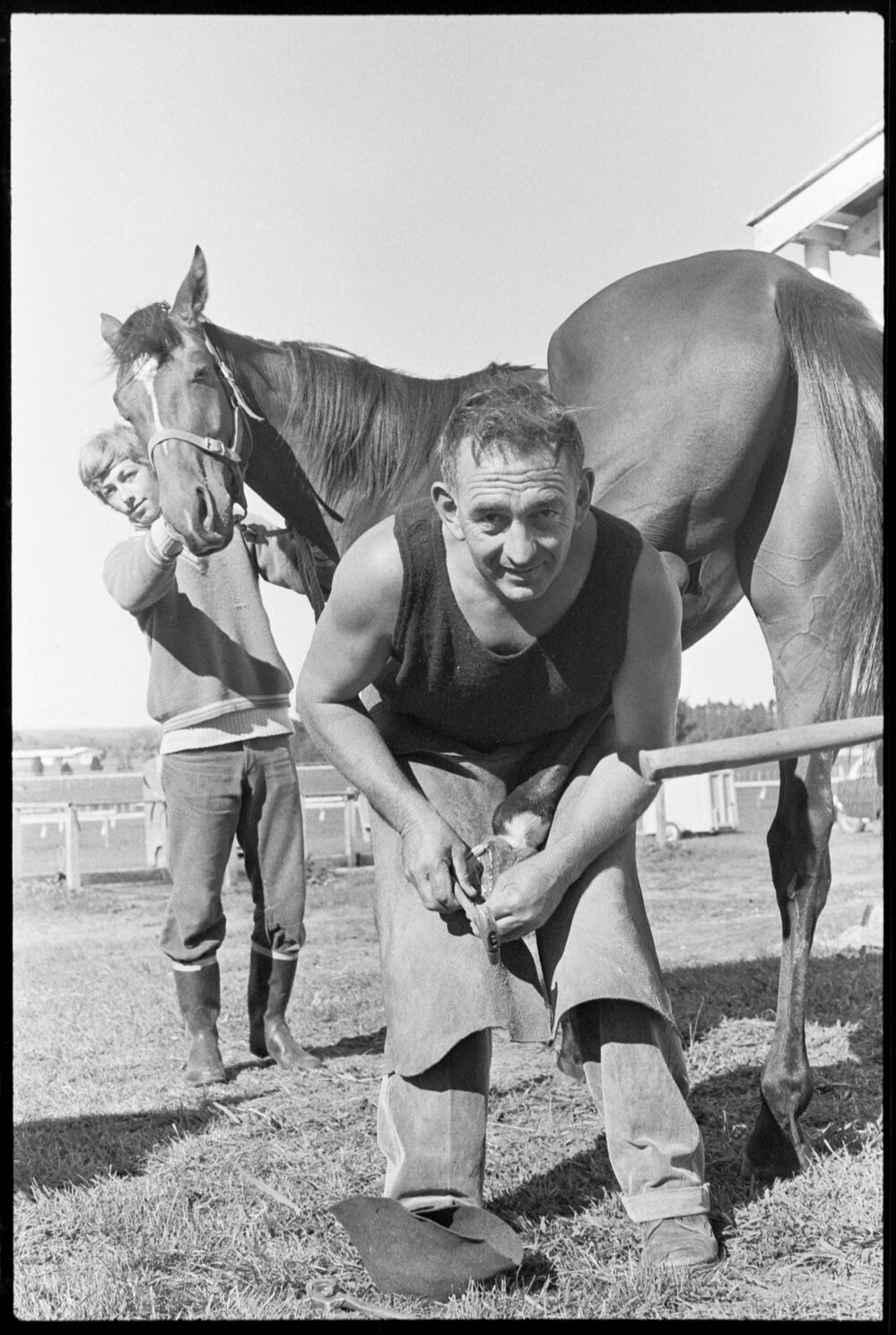 Date14 April 1972Reference Numberphoto gcc-19946DescriptionTauranga farrier, Mr Joe Honeyfield, putting racing shoes on Sea Imp for the Japan-Bay of Plenty International Trophy race. Also pictured is apprentice jockey, Greg Sorich. Published 14 April 1972.FormatNegativePhysical Description35mm black-and-white negative (1/3)Photographer/CreatorBay of Plenty Times