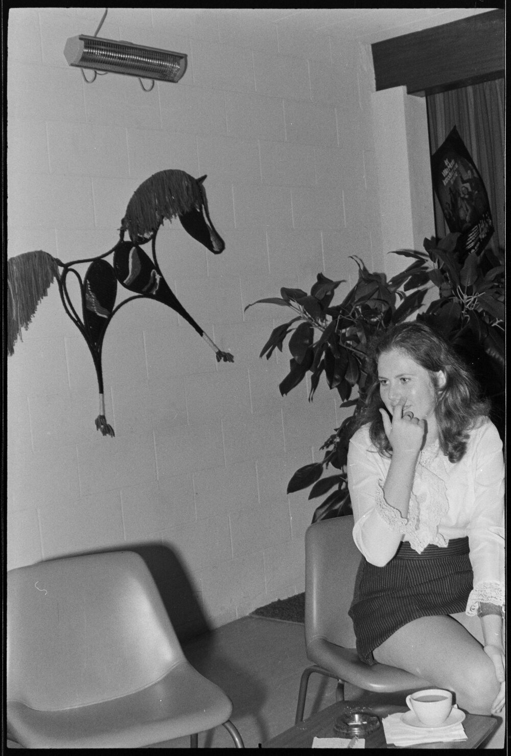 Date15 April 1972Reference Numberphoto gcc-19978DescriptionWoman sits in foyer with horse motif on wall. Published 15 April 1972.FormatNegativePhysical Description35mm black-and-white negative (3/3)Photographer/CreatorBay of Plenty Times