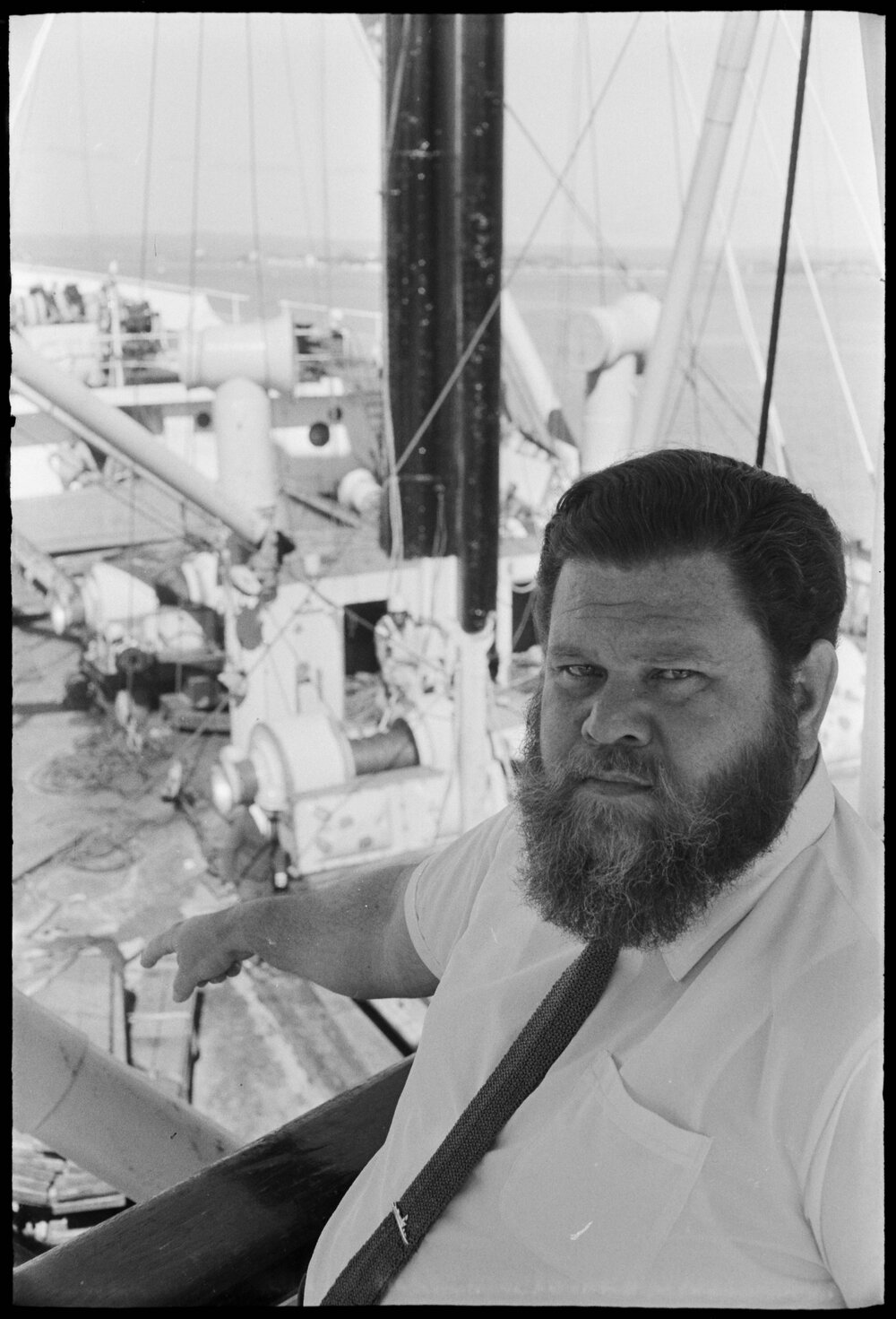 Date15 April 1972Reference Numberphoto gcc-20013DescriptionCaptain Harvey on the upper deck of the Carpentaria, watching the loading of milk powder. Published 15 April 1972.FormatNegativePhysical Description35mm black-and-white negative (1/3)Photographer/CreatorBay of Plenty Times