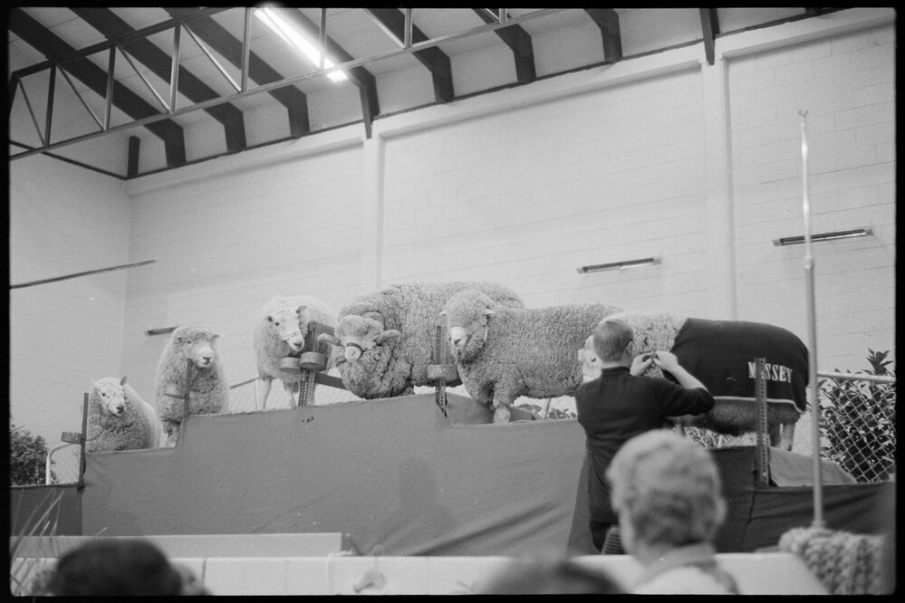 Date31 May 1971Reference Numberphoto gcc-20128DescriptionAn Expo Wool Show was held at the Queen Elizabeth Youth Centre with a performance by the NZ Wool Board's trained sheep a fashion parade with woollen garments and demonstrations by spinners, weavers and knitters. The show was presented by the Melrose Home and Hospital as a fundraiser. Published 31 May 1971.FormatNegativePhysical Description35mm black-and-white negative (4/7)Photographer/CreatorBay of Plenty Times