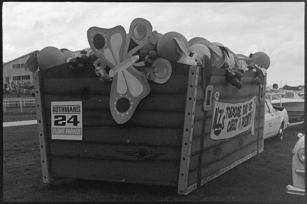 Date1971Reference Numberphoto gcc-20204DescriptionThe Bay of Plenty Orange Festival Parade. Treasure chest of huge oranges with Annette Woodcraft on top, by Bay of Plenty Savings Bank constructed by Rotaract Youth Group. Published in 1971.FormatNegativePhysical Description35mm black-and-white negative (6/6)Photographer/CreatorBay of Plenty Times
