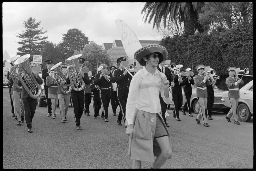 Date1971Reference Numberphoto gcc-20221DescriptionThe Bay of Plenty Orange Festival Society's float parade made its way down Tauranga's Cameron Road from Second Avenue to the Tauranga Racecourse in Greerton. Marching brass band with man in Mexican hat in front. Published in 1971.FormatNegativePhysical Description35mm black-and-white negative (4/5)Photographer/CreatorBay of Plenty Times