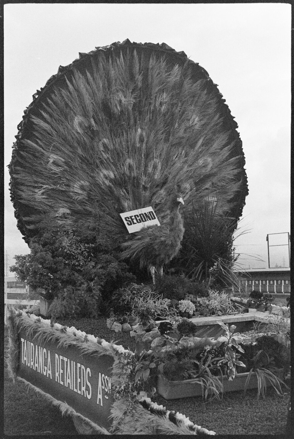 Date1971Reference Numberphoto gcc-20234DescriptionHuge peacock made out of dyed Toi-Toi for Tauranga Retailers Association. Riding on the float are Cristie Fyson, Sandra Eades and Rodele van Woerden. Orange Festival Parade. Published in 1971.FormatNegativePhysical Description35mm black-and-white negative (2/4)Photographer/CreatorBay of Plenty Times