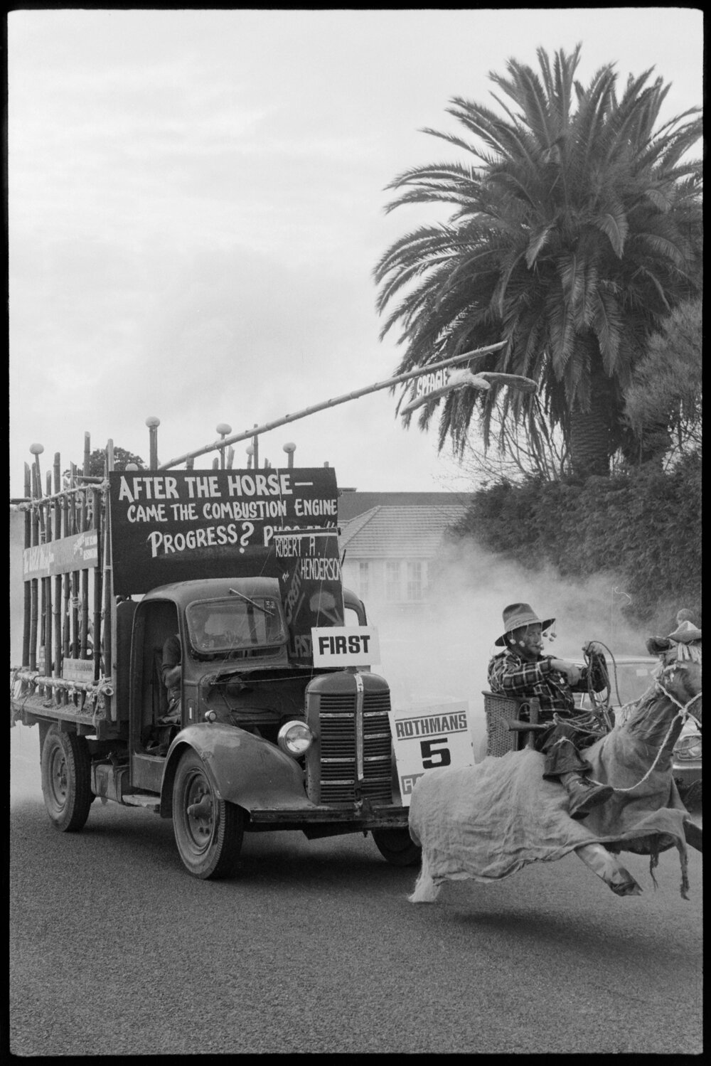 Date1971Reference Numberphoto gcc-20245DescriptionThe Tauranga Carrying Company with Bob Henderson riding the "Horse". Orange Festival Parade. Published in 1971.FormatNegativePhysical Description35mm black-and-white negative (4/5)Photographer/CreatorBay of Plenty Times