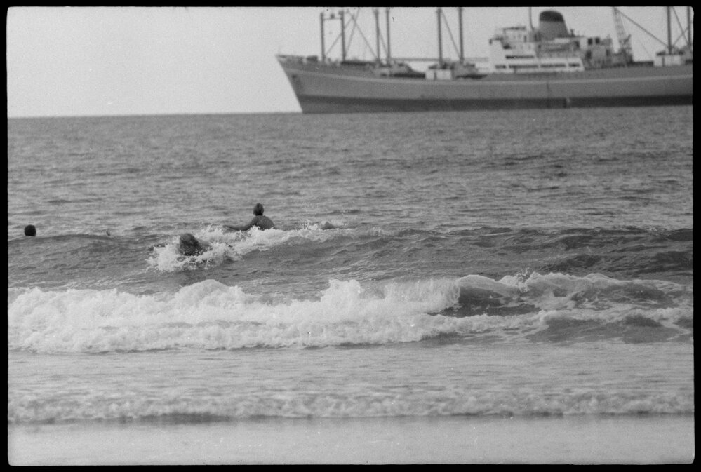Date1971Reference Numberphoto gcc-20276DescriptionContainer ship in background at Mount Maunganui beach with Tauranga Boys' College Athletic Sports, including surfing. Published in 1971.FormatNegativePhysical Description35mm black-and-white negative (1/6)Photographer/CreatorBay of Plenty Times