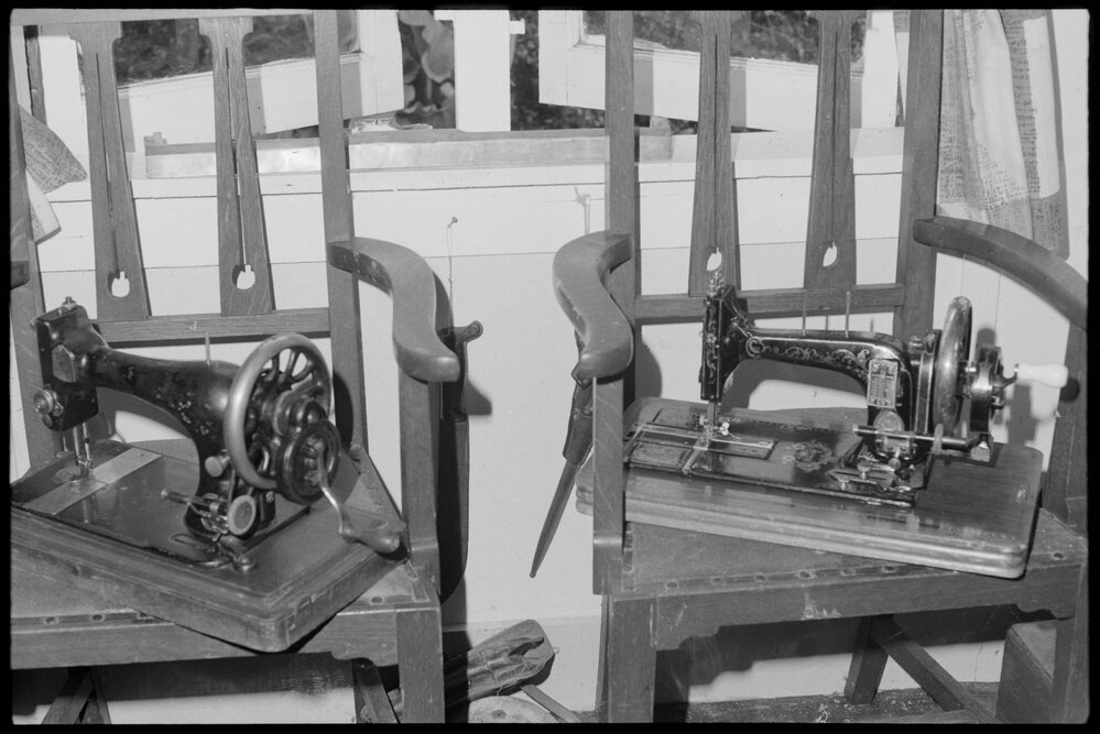 Datec. 1971Reference Numberphoto gcc-20348DescriptionŌngare Point Museum, Athenree. Sewing machines on display.FormatNegativePhysical Description35mm black-and-white negative (5/5)Photographer/CreatorBay of Plenty Times