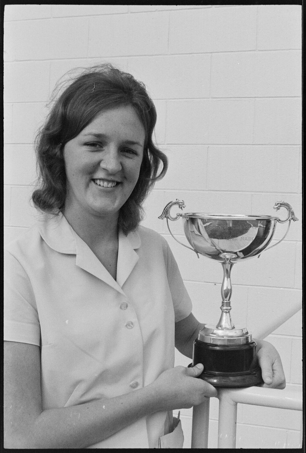 Date4 May 1972Reference Numberphoto gcc-20427DescriptionLindy Habgood, secretary of the Tauranga branch of the Youth Hostel Association, holding the Walter Nash Cup. Published 4 May 1972.FormatNegativePhysical Description35mm black-and-white negative (1/5)Photographer/CreatorBay of Plenty Times