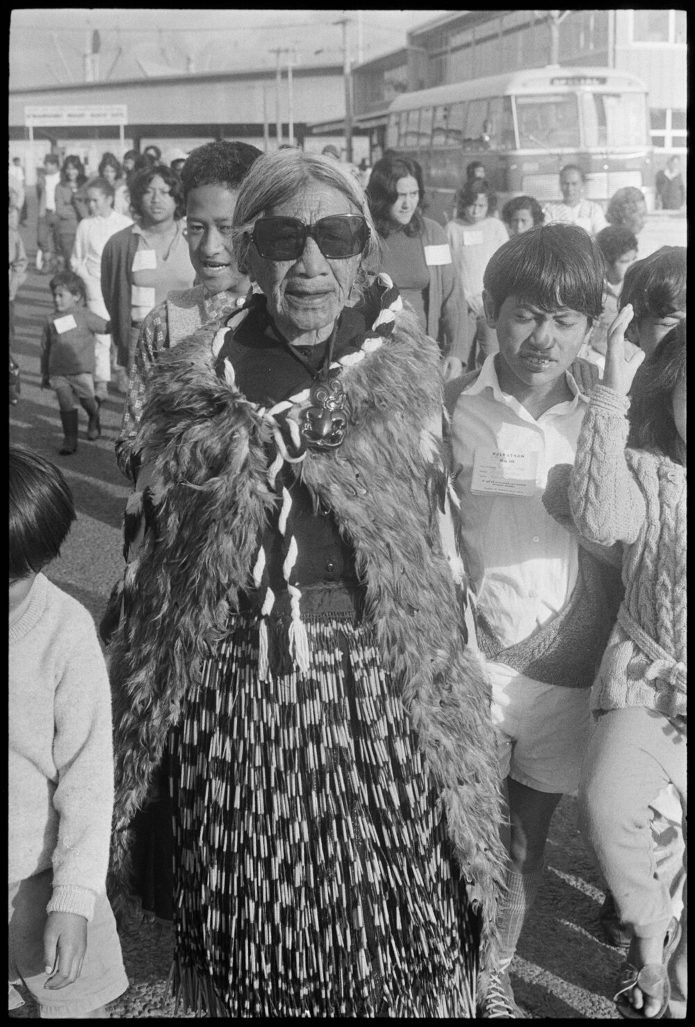 Date6 May 1972Reference Numberphoto gcc-20490DescriptionMrs Mauria Henare, aged 96, leads her Te Puke relatives of Waitaha iwi, on a sponsored trek from Mount Maunganui wharf to the Manoeka Pā in Te Puke. Published 6 May 1972.FormatNegativePhysical Description35mm black-and-white negative (3/3)Photographer/CreatorBay of Plenty Times