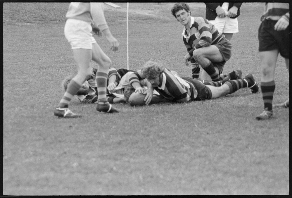 Date8 May 1972Reference Numberphoto gcc-20492DescriptionOld Boys in rugby match against Cadets at the Tauranga Domain. Published 8 May 1972.FormatNegativePhysical Description35mm black-and-white negative (2/3)Photographer/CreatorBay of Plenty Times