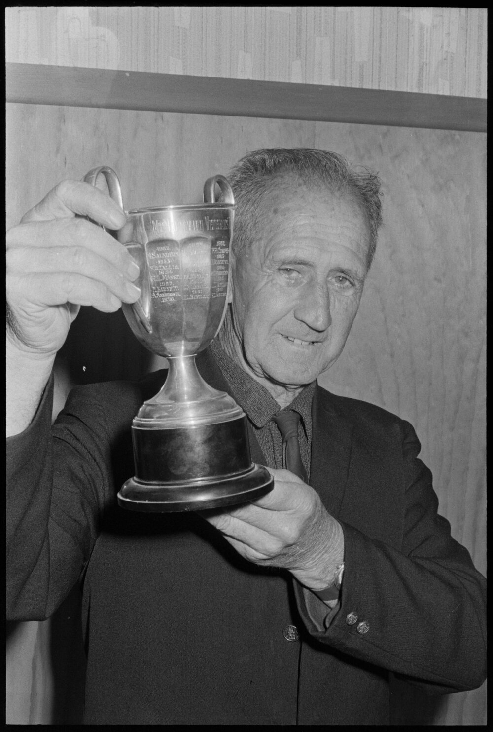 Edgar Hollis with Guy Marriott Memorial Cup (15 September 1973). Pae Korokī, accessed 08/04/2026, https://paekoroki.tauranga.govt.nz/nodes/view/109109
