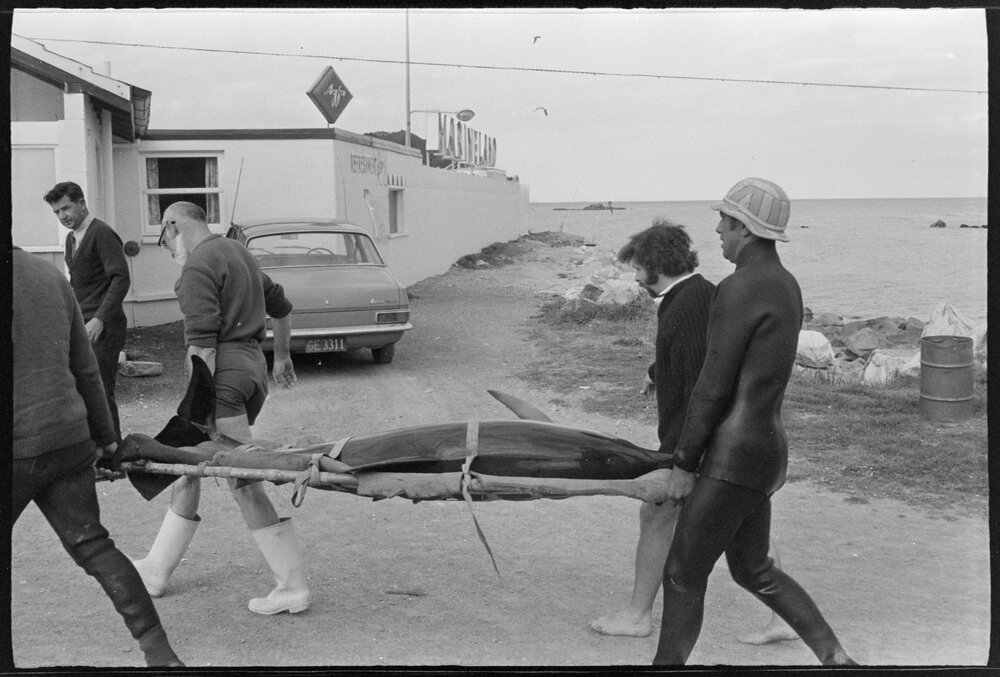 Date17 September 1973Reference NumberPhoto gcc-29636DescriptionDolphin gets carried to Marineland pool by Marineland staff who caught it off the big game fishing launch Facilita, a few miles east of Motītī Island. Published 17 September 1973.FormatNegativePhysical Description35mm black-and-white negative (3/3)Photographer/CreatorBay of Plenty Times