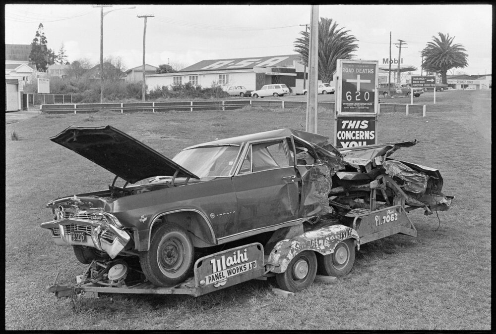 Car wreck used as a display for Waihī Panel Works Ltd (25 September 1973). Pae Korokī, accessed 08/04/2026, https://paekoroki.tauranga.govt.nz/nodes/view/109205