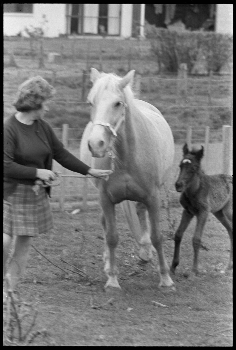 Date24 September 1973Reference NumberPhoto gcc-29815DescriptionMrs Scott with Golden girl and her new foal on their Ōropi farm. Not published 24 September 1973.FormatNegativePhysical Description35mm black-and-white negative (3/3)Photographer/CreatorBay of Plenty Times